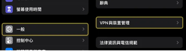 至手機【設定】➠【一般】➠ 【VPN與裝置管理】